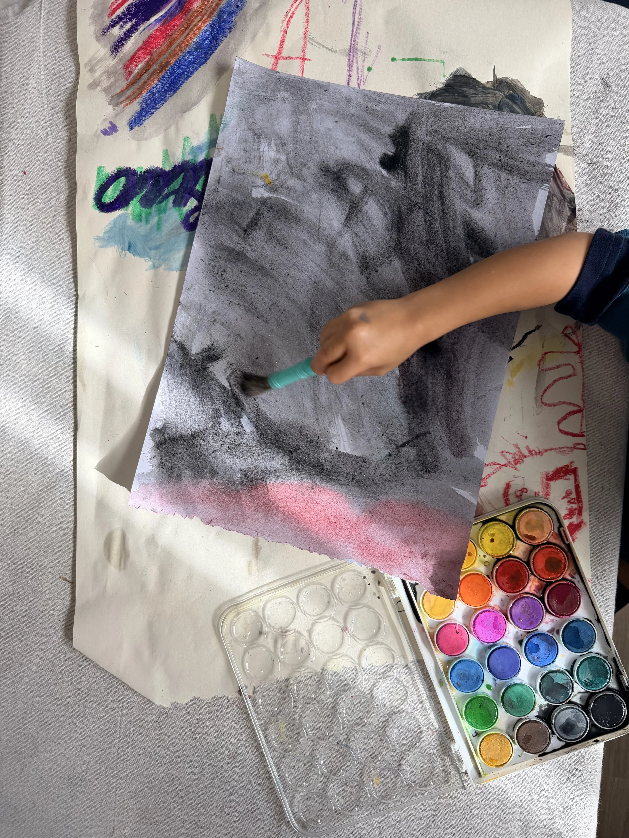 Relaxed and playful art exploration through open ended materials using colour, texture and imagination